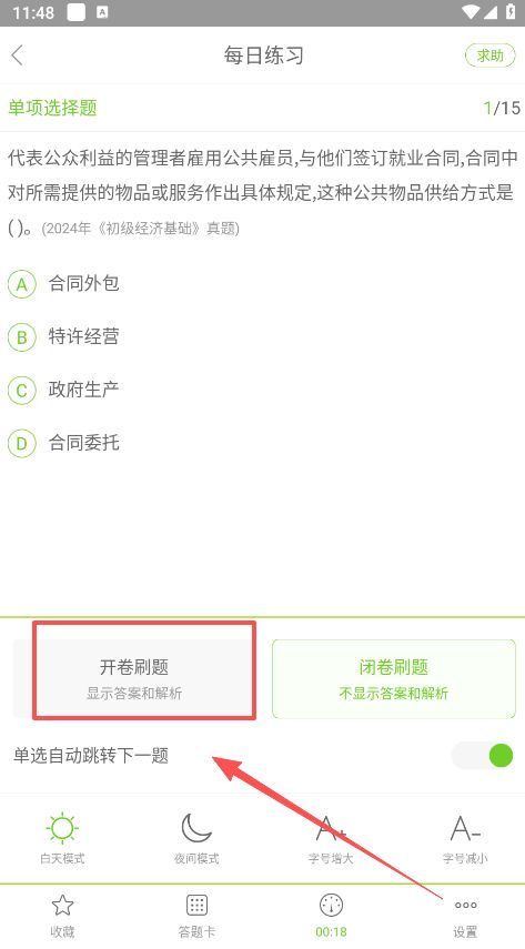 3、在弹窗中选择开卷刷题,会同时显示答案和解析,当然还是建议同学们先自己练习然后查看解析