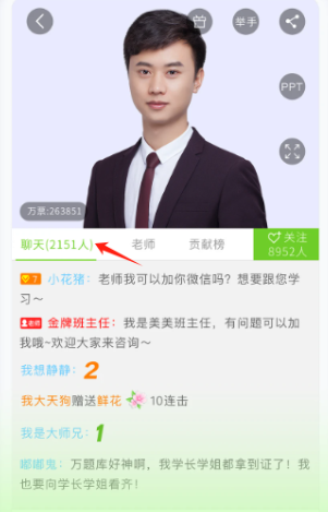 2、点击直播互动界面老师头像展示,聊天区互动热烈,学员提问、送花,班主任答疑,氛围活跃。